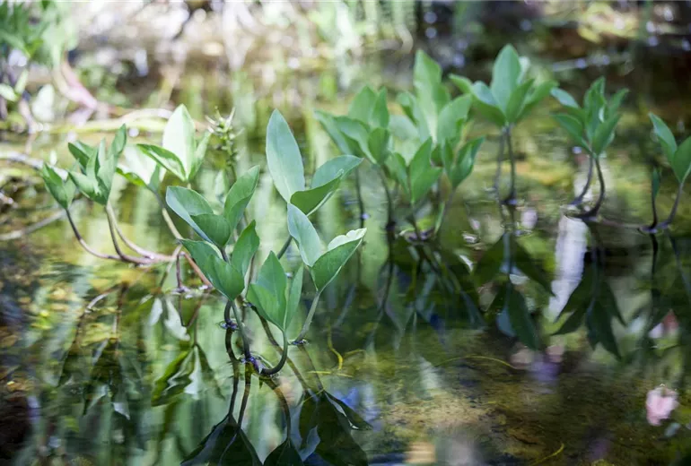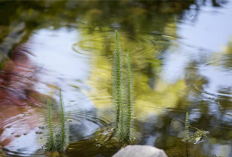 Wie bei Menschen auch, zählen im Teich die inneren Werte. Und die lassen sich nicht mit dem bloßen Auge erkennen, sondern messen. Gesundes Teichwasser sollte einen pH-Wert von 7,5 bis 8,5 haben und eine Karbonathärte aufweisen, die über 5° dH liegt. Schwankungen in diesen Bereichen sorgen für vermehrte Algenbildung und bringen das Gleichgewicht im Gartenteich durcheinander. Algen sind im Gartenteich aber wichtig und dürfen nicht komplett fehlen. Sie produzieren Sauerstoff und sind die Basis der Nahrungskette im Gartenteich. Zuletzt sollten auch überschüssige Nährstoffe reduziert werden. Durch Futterreste, Laub und abgestorbene Pflanzenteile gelangen Phosphate ins Wasser. Liegt die Konzentration von Phosphat im Gartenteich schon über 0,035 mg/L, breiten sich Algen rasend schnell aus. Abhilfe schaffen spezielle Mittel aus dem Fachhandel, die das Gleichgewicht im Teich wieder herstellen.